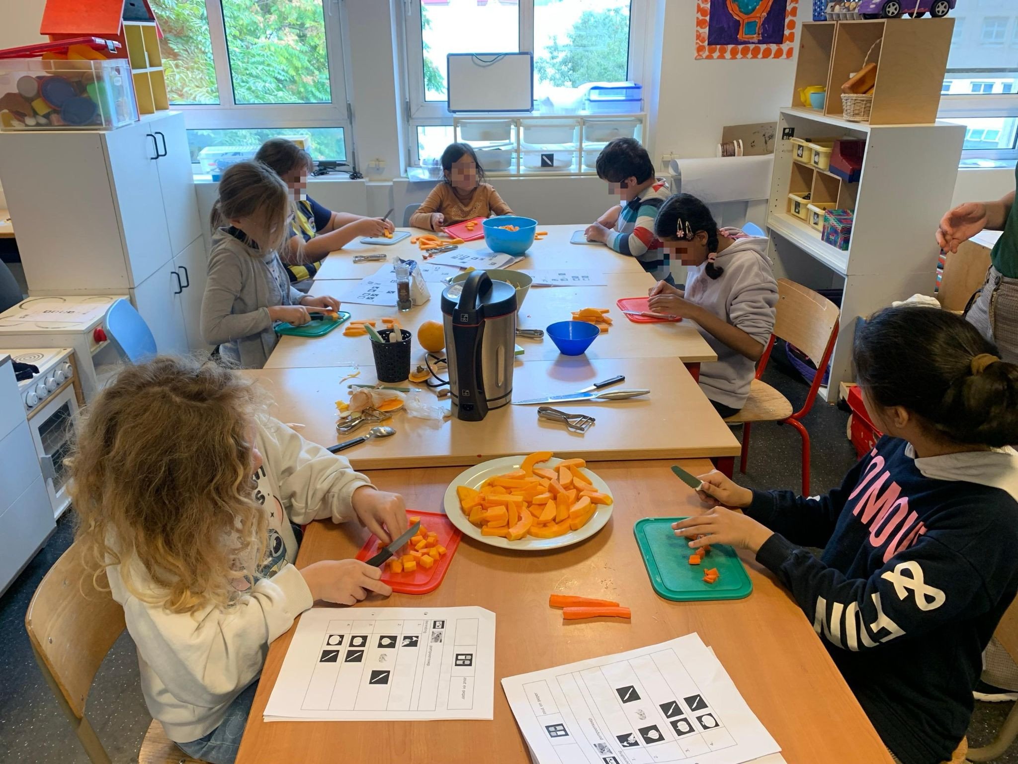 Notre école extraordinaire offre un enseignement aux enfants présentant un handicap mental modéré à sévère. Pendant les cours, les enfants de maternelle goûtent et ceux du primaire cuisinent avec la classe afin d'accroître leur autonomie. Nous faisons les courses, goûtons et cuisinons ensemble. Grâce aux ressources de Dans la Boîte, nous pouvons préparer des recettes saines.