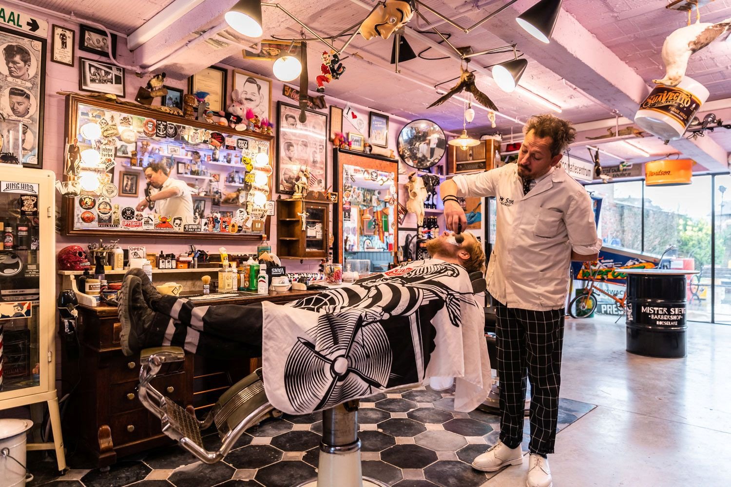 Een unieke vintage barbershop met een echte rock ‘n roll-sfeer. Kom gerust langs in ons rariteitenkabinet en geniet van een fantastische haar- en/of baardsnit in een omgeving vol curiosa. Met openlucht-barbershop (bij mooi weer) (wegens grote drukte ENKEL op afspraak: 0486833373). Kattenstraat 87.