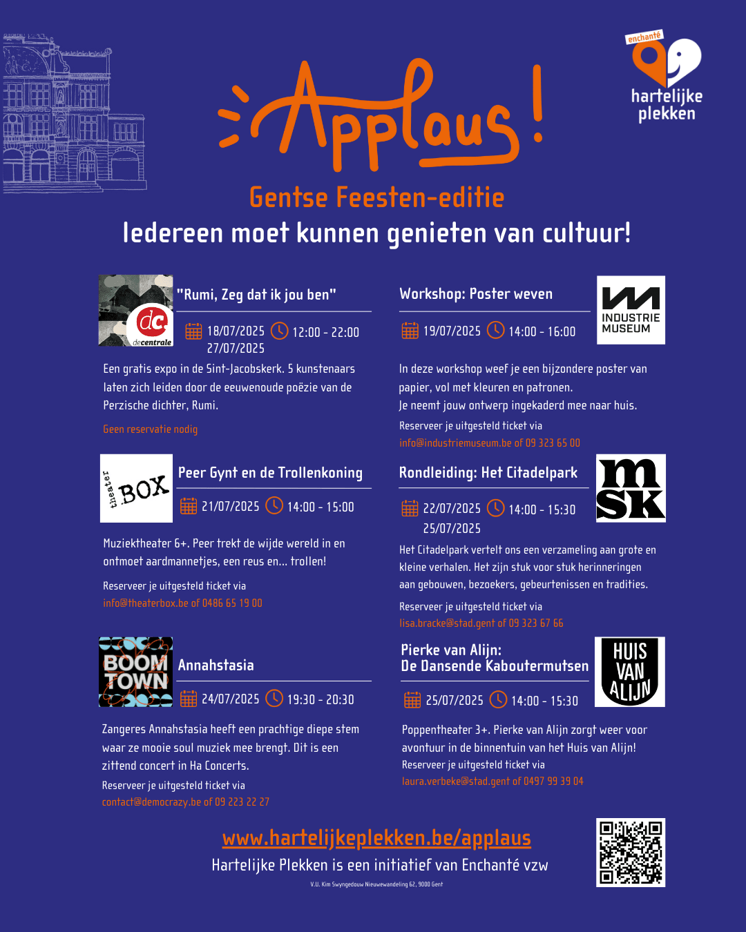 Maar toegang tot cultuur is niet voor iedereen vanzelfsprekend. Het aanbod is soms overweldigend, onbetaalbaar of gewoon moeilijk te vinden. Daarom zijn wij er opnieuw bij met een Gentse Feesten-editie van Applaus!